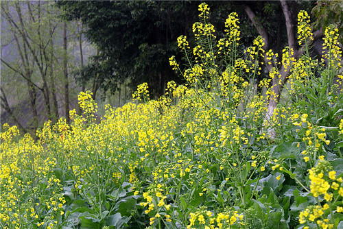 穿過臺(tái)階,走出巖洞,一陣清涼的風(fēng)帶著濕潤(rùn)的水氣撲面而來,眼前豁然開朗。地形呈一個(gè)小盆地,有果樹圃、商店等,一個(gè)小小的世外桃源呈現(xiàn)眼前,山坡下那郁郁蔥蔥的各種青翠的林木盡收眼底,沿著之字回旋而下的山路到達(dá)山腳,一眼望去都是金黃的油菜花,沿著河灘的大片層級(jí)蔓延,……,走在其中散發(fā)樸實(shí)的香氣,看著蜜蜂在枝頭花間舞蹈,露珠在花葉間跳躍,在我的眼里,那是一種磅礴而不嘩的美,這樣一種平凡的花,美得如此獨(dú)立而出塵!那陣陣的清風(fēng),送走了我們開心的笑聲,大家陶醉在春光中快樂地拍照,美好的一天沐浴在油菜花香中輕松度過。