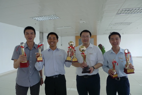 男子組飛鏢,共有13人參賽。分?jǐn)?shù)以每人共投擲8支飛鏢的成績(jī)總和計(jì)算,工程部項(xiàng)目副經(jīng)理鐘國(guó)輝可謂佼佼者,他平常也熱衷飛鏢運(yùn)動(dòng),午間休息時(shí),可以??吹剿陲w鏢區(qū)域認(rèn)真投擲。比賽當(dāng)天,他以穩(wěn)定的發(fā)揮,熟練的技術(shù)傲視群雄,讓我們充分相信冠軍是為有準(zhǔn)備的人而來。