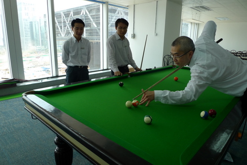桌球比賽分為英式和美式,共有26人報(bào)名參賽。美式桌球報(bào)名者偏多,當(dāng)然少不了高手。參賽選手為大家奉上了一場(chǎng)又一場(chǎng)精彩的比賽,讓觀看者們一飽眼福。幾個(gè)回合下來,爭(zhēng)奪冠軍的強(qiáng)手相遇了,一場(chǎng)勢(shì)均力敵的對(duì)決上演,每次出桿的精準(zhǔn),總是贏來陣陣喝彩,特別是英式桌球的冠軍爭(zhēng)奪在行政人事部副經(jīng)理梁秀文與行政人事部楊春靈之間,兩人分?jǐn)?shù)不相上下,桌球臺(tái)上僅剩一顆黑球來決定他們的勝負(fù),進(jìn)球的角度復(fù)雜,難度大。結(jié)果梁經(jīng)理以一桿超水準(zhǔn)的出擊,黑球完美入袋,讓觀看的人嘆服的鼓掌與尖叫。美式桌球的冠軍爭(zhēng)奪在行政人事部經(jīng)理王偉敬與行政人事部楊春靈之間進(jìn)行,首先王經(jīng)理拿下一局,緊接著楊春靈拿下第二局,最后雙方進(jìn)入緊張激烈的決勝局,雙方展現(xiàn)出優(yōu)良的技術(shù)魅力,最終楊春靈取得比賽勝利。