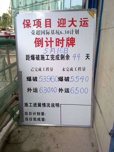 深基坑開(kāi)挖的技術(shù)標(biāo)準(zhǔn)頗高,公司領(lǐng)導(dǎo)非常重視此項(xiàng)目,總經(jīng)理經(jīng)常到現(xiàn)場(chǎng)指導(dǎo)工作,鼓勵(lì)大家一起努力完成目標(biāo)。由于地鐵三號(hào)線6月30日運(yùn)行、大運(yùn)會(huì)制約等因素,現(xiàn)場(chǎng)的工作遇到重重困難,必須趕在此日期前完成基坑爆破及挖運(yùn)工作,目前這成為迫在眉睫的問(wèn)題。接到通知,工程部領(lǐng)導(dǎo)馬上召集相關(guān)人員開(kāi)會(huì),大家群策群力,現(xiàn)場(chǎng)管理班組牽頭擬制施工計(jì)劃,加強(qiáng)現(xiàn)場(chǎng)工作執(zhí)行力度,共同解決難題。楊副總根據(jù)現(xiàn)場(chǎng)實(shí)際情況,出謀劃策,提出制定“保項(xiàng)目、迎大運(yùn)”倒計(jì)時(shí)牌,看著每日遞減的數(shù)字,大家化壓力為動(dòng)力,以飽滿的激情和熱情共同拼搏奮斗。