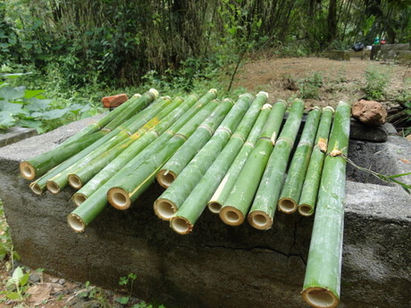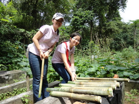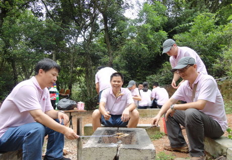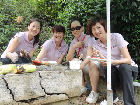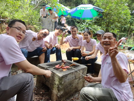 金龜村,是一個(gè)擁有四百年歷史的客家古村落,依山傍水、鳥語花香,并設(shè)有各種自助悠閑設(shè)施,包括燒烤區(qū)、垂釣區(qū)、百果園等,這里處處充滿著農(nóng)家生活閑情,處處譜寫著人與自然的諧和。當(dāng)我們到達(dá)金龜村后,沿著石板路,向山頂前進(jìn),山里人煙稀少,幽靜得只聽到鳥蟲鼓噪,蛙叫聲聲,偶爾還伴幾聲雞鳴狗吠。約步行30分鐘后,我們到達(dá)了山頂?shù)男蓍e生活區(qū),大家有的忙著支起麻將桌開始霸王爭(zhēng)奪戰(zhàn);有的坐在榕樹下玩起象棋、聊起心事;有的則去百果園,體驗(yàn)果農(nóng)的采摘生活——荔枝已經(jīng)碩果累累;龍眼已經(jīng)萌芽待花;菠蘿已經(jīng)花香撲鼻,所有的瓜瓜果果已經(jīng)沖出地面,展示著生命的活力;有的還去池塘邊進(jìn)行垂釣,嘗試著“愿者上鉤”的生活******。當(dāng)大家饑腸轆轆的時(shí)候,迎來了別具一格的燒烤——夏天的露天燒烤,和食物一起被烤熟的感覺,真是暢快!燒烤區(qū)里充滿著豬扒、雞翅、雞腿、丸子、玉米、番薯、茄子、韭菜的香味,還伴著大家的歡聲笑語,迎著驕陽,我們的快樂感染著這里的一草一木。特別值得一提的是,我們自制的竹筒飯,將竹筒的一端開一個(gè)小口,然后裝入四分之三的臘腸飯,剩下的四分之一裝好水,再用筍尖堵住小口便可以上火烤了,半個(gè)多小時(shí)后便可聽到竹子發(fā)出滋滋的歡叫聲,竹筒飯便宣告成功,吃著自己做的竹筒飯,大家胃口大增,不亦樂乎!
