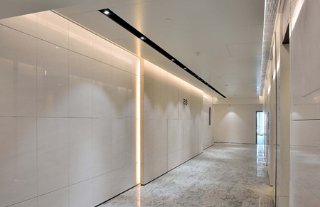 電梯廳空間,墻面采用雅士白、貝米金黃兩種進口石材拼接造型,地面為高檔石材銀影灰,天花搭配射燈營造光影效果,整個空間簡潔而富有層次。