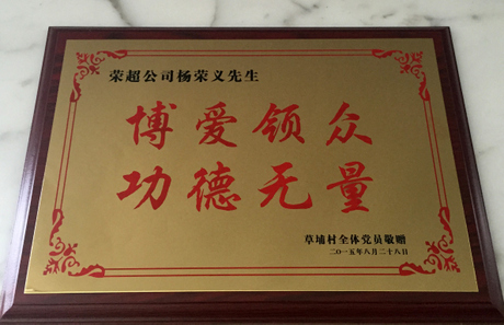 值此抗戰(zhàn)勝利70周年之際,深圳草埔村全體黨員代表一行來到榮超向董事長敬贈“博愛領眾、功德無量”獎牌。這塊獎牌彰顯了董事長愛黨、忠于黨的赤子情懷,以及他作為一名黨員企業(yè)家的責任和社會擔當。
