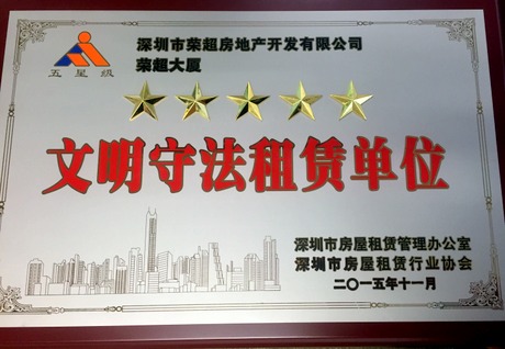 ●11月我司榮超大廈榮獲五星級“文明守法租賃單位”。該獎牌由深圳市房屋租賃管理辦公室和深圳市房屋租賃行業(yè)協(xié)會共同頒發(fā)。