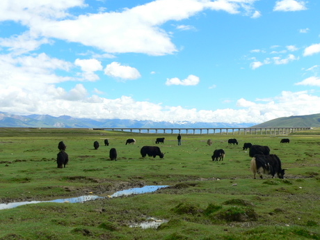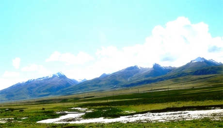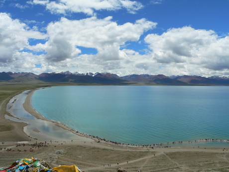 納木措是一處高原湖泊,位于拉薩城西北方向230公里,湖水面積約1920平方千米,海拔4718m,是我國第二大、世界最高的咸水湖,納木措的藏語含義即是“天湖”。這是此次川藏行的最后一處景點(diǎn),也是最能代表西部高原自然和人文精神的去處。八月二十日早八點(diǎn),我們一行人驅(qū)車沿青藏公路往當(dāng)雄縣方向駛?cè)?。因?yàn)椴貐^(qū)公路普遍施行交通管制,車輛嚴(yán)格限速,車隊(duì)只得徐徐行駛。沿途經(jīng)過遼闊的羌塘草原,草肥水美,牛羊星羅棋布,氈蓬在晨光下五彩輝映,遠(yuǎn)處念青唐古拉山脈層巒疊嶂,云間有冰峰若隱若現(xiàn),好一幅藏北高原的美麗風(fēng)光。據(jù)說此地還是野生動(dòng)物的天堂,也許是緣分不夠,未得一飽眼福;著名的冬蟲夏草也主要產(chǎn)于這一帶的山坡草地,當(dāng)然這次我們只能在特產(chǎn)店里見到這個(gè)神物了。一路邊看邊行,欣賞拍照,我們于午后到達(dá)湖區(qū)。