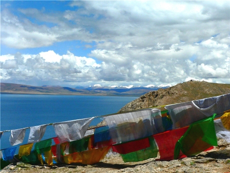 山上掛滿藏人信徒祈福的經(jīng)幡,在藍(lán)天白云襯托之下隨風(fēng)飛舞,五彩繽紛,甚是好看。據(jù)說這經(jīng)幡起源于十二世紀(jì)初的藏傳佛教噶舉派寺院,也稱風(fēng)馬旗,顏色分白、黃、紅、綠、藍(lán)五種?!帮L(fēng)馬”的意思是:“風(fēng)是傳播、運(yùn)送印在經(jīng)幡上的經(jīng)文遠(yuǎn)行的工具和手段,是傳播運(yùn)送經(jīng)文的一種無形的馬,馬即是風(fēng)?!辈孛褡逭J(rèn)為雪域藏地的崇山峻嶺、大江莽原的守護(hù)神是天上的贊神和地上的年神,他們經(jīng)常騎著風(fēng)馬在雪山、森林、草原、峽谷中巡視,保護(hù)雪域部落的安寧祥和,抵御魔怪和邪惡的入侵。這種意識(shí)是用經(jīng)幡上印有一匹背馱象征福祿壽財(cái)興旺的“諾布末巴”(圓錐形火焰圖案)行走的馬,以及印在經(jīng)幡上的咒語、經(jīng)文或祈愿文的圖像來表達(dá)的。不單在這里,我們一路經(jīng)過的藏區(qū)各處,在山間水域,遠(yuǎn)遠(yuǎn)的都可看見風(fēng)中飄舞的風(fēng)馬經(jīng)幡,它已經(jīng)成了藏區(qū)大地蒼穹的靈魂符號(hào)。到這時(shí),才想起納木措原本也是藏傳佛教的一處圣地。自十二世紀(jì)末,藏傳佛教達(dá)隆嘎舉派創(chuàng)始人達(dá)隆塘巴扎西貝等高僧,曾到湖上修習(xí)密宗要法,并始創(chuàng)羊年環(huán)繞納木靈湖之舉。信徒傳說,每到藏歷羊年,諸佛、菩薩、護(hù)法神集會(huì)在納木湖設(shè)壇大興法會(huì),若信徒此時(shí)前往朝拜,轉(zhuǎn)湖念經(jīng)一次,勝過平時(shí)朝禮轉(zhuǎn)湖念經(jīng)十萬次,其福無量。所以每到藏歷羊年僧俗信徒不惜長途跋涉,前往轉(zhuǎn)湖。這一活動(dòng)在四月十五達(dá)到高潮。此時(shí)我等世俗凡人,三步一喘五步一歇的不速之客,面對(duì)神圣湖水,就在靜默中去體驗(yàn)三百多公里轉(zhuǎn)湖一周的圣舉吧。不求靈魂超越,祈望能求得幾分佛祖散播的福祉。